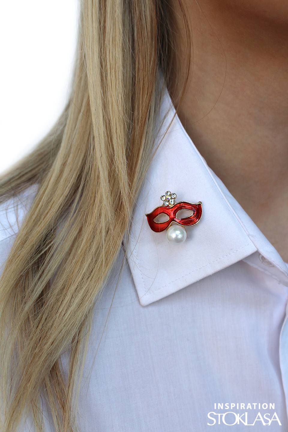 Metalowa broszka z elegancką maską to oryginalny dodatek modowy. Ozdobiona jest perłą i kwiatkiem z ciętych koralików. Tę pomysłową ozdobę można nosić do różnych stylizacji, zarówno do wieczorowej sukienki, jak i do codziennego stroju. Można ją również nosić do czapki, torebki lub przypiąć do szalika. Z tyłu broszka posiada broszkę. Broszka umieszczona jest na plastikowej karcie, którą można powiesić na stoiskach sprzedażowych.
