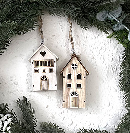 Dzięki pętelce można zawiesić te małe drewniane domki na choince, ozdobnym wieńcu, na gałązkach w wazonie itp. Nadają się do całorocznych aranżacji. Dzięki dyskretnemu designowi idealnie wpasowują się w różnorodne style wnętrzarskie. Domki są dwustronne i występują w dwóch rozmiarach.
