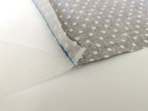 1) Na przedniej stronie bawełnianej tkaniny ułóż włókninę i w górnej części zszyj ze sobą materiały.